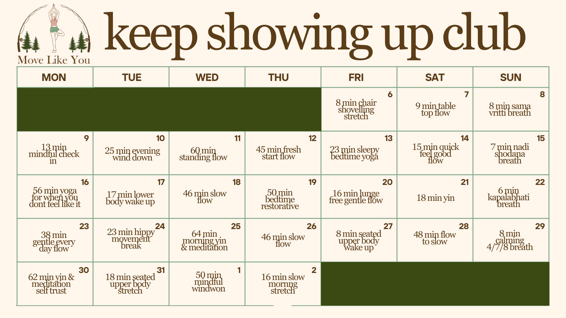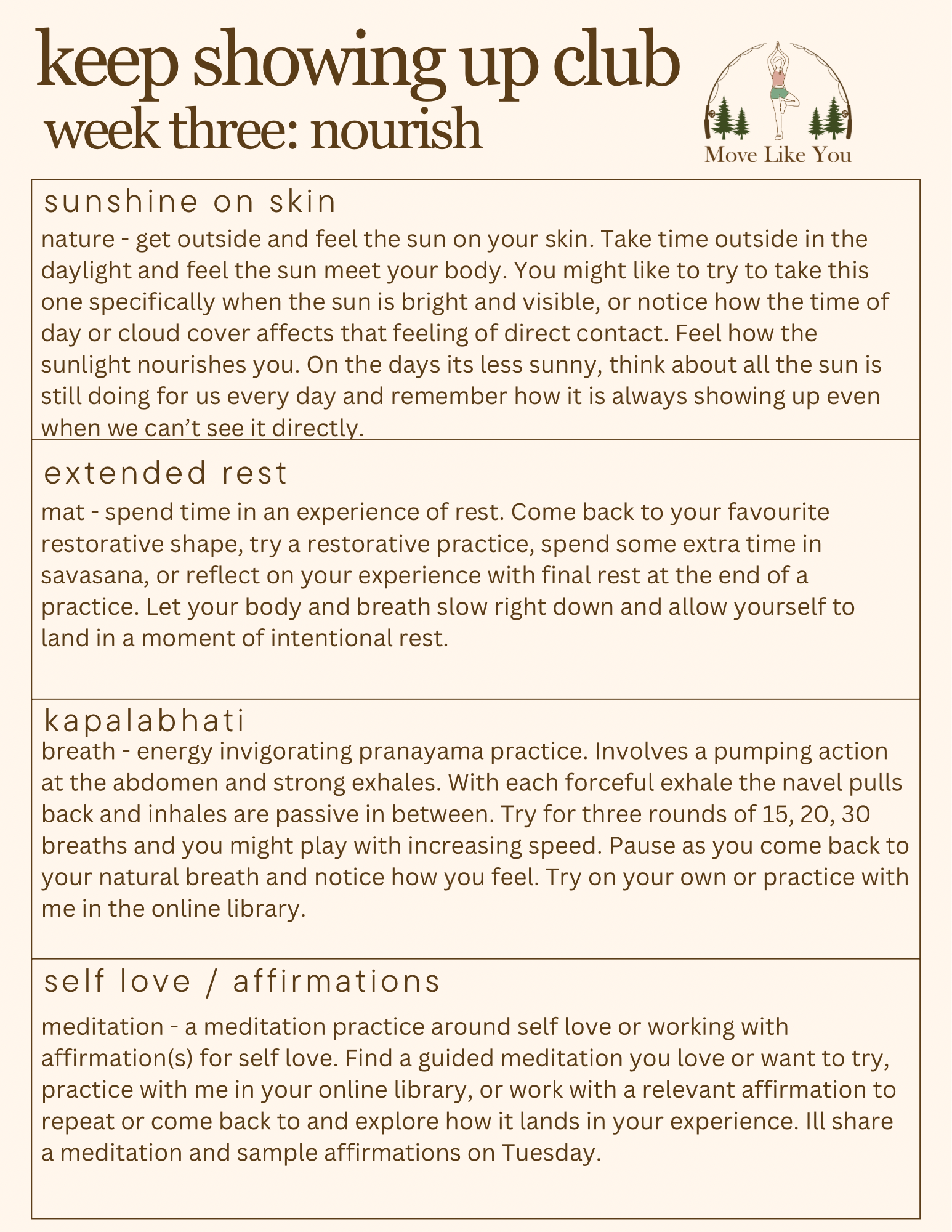 Again, this is your practice to put in the time and space you have and want to offer. These can all be done in a few short moments, and there are ways to expand on each. Assess what you’ve done the first weeks - how it went, how it fit into your days, how it made you feel. Continue to allow yourself to adjust accordingly to set yourself up to be able to keep showing up. Learning what that means for you throughout all moods, energies, and experiences, and all the different ways that can look. We try, we learn, we adapt, we keep trying, we keep learning, we keep adapting. We keep showing up.