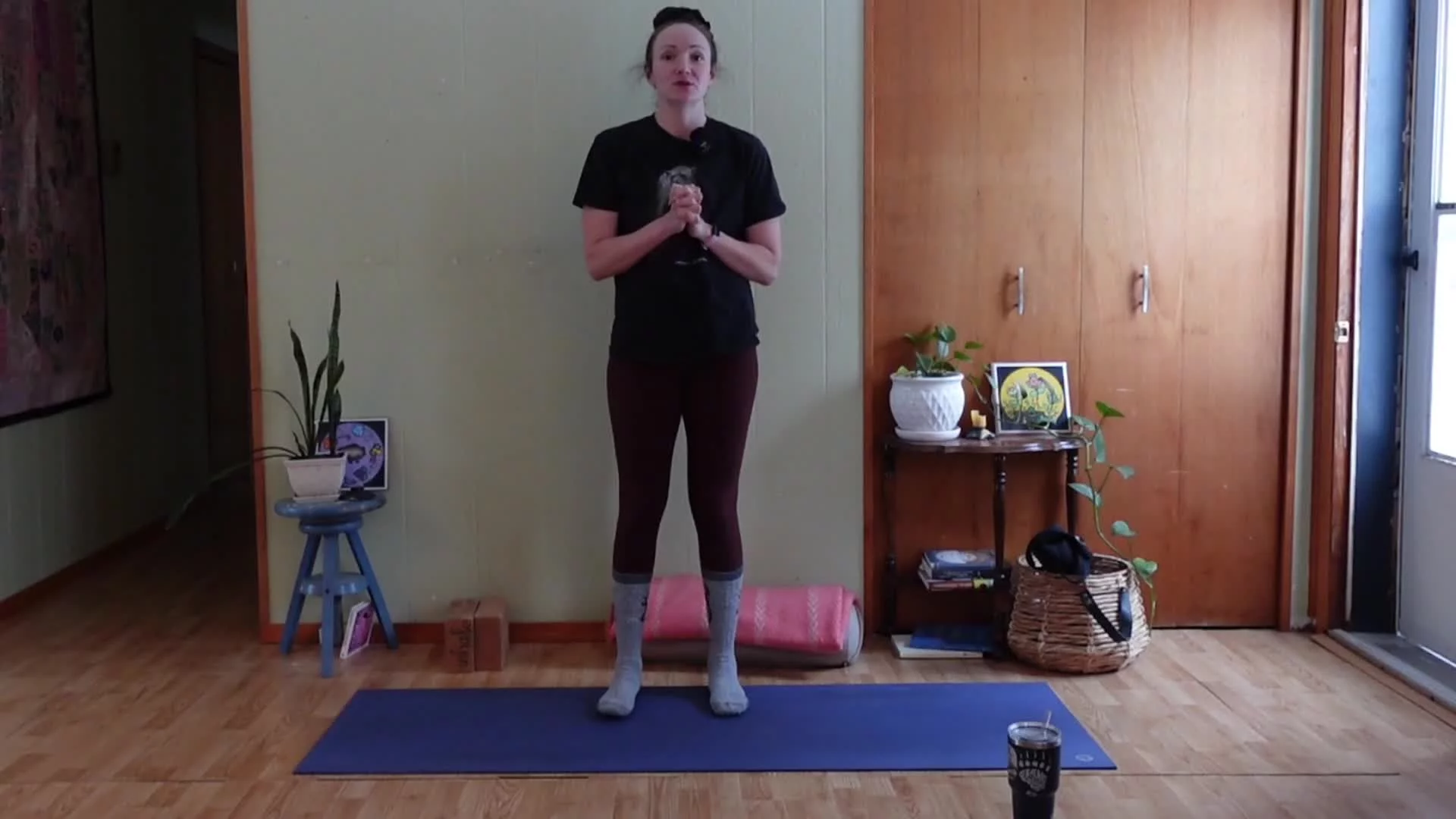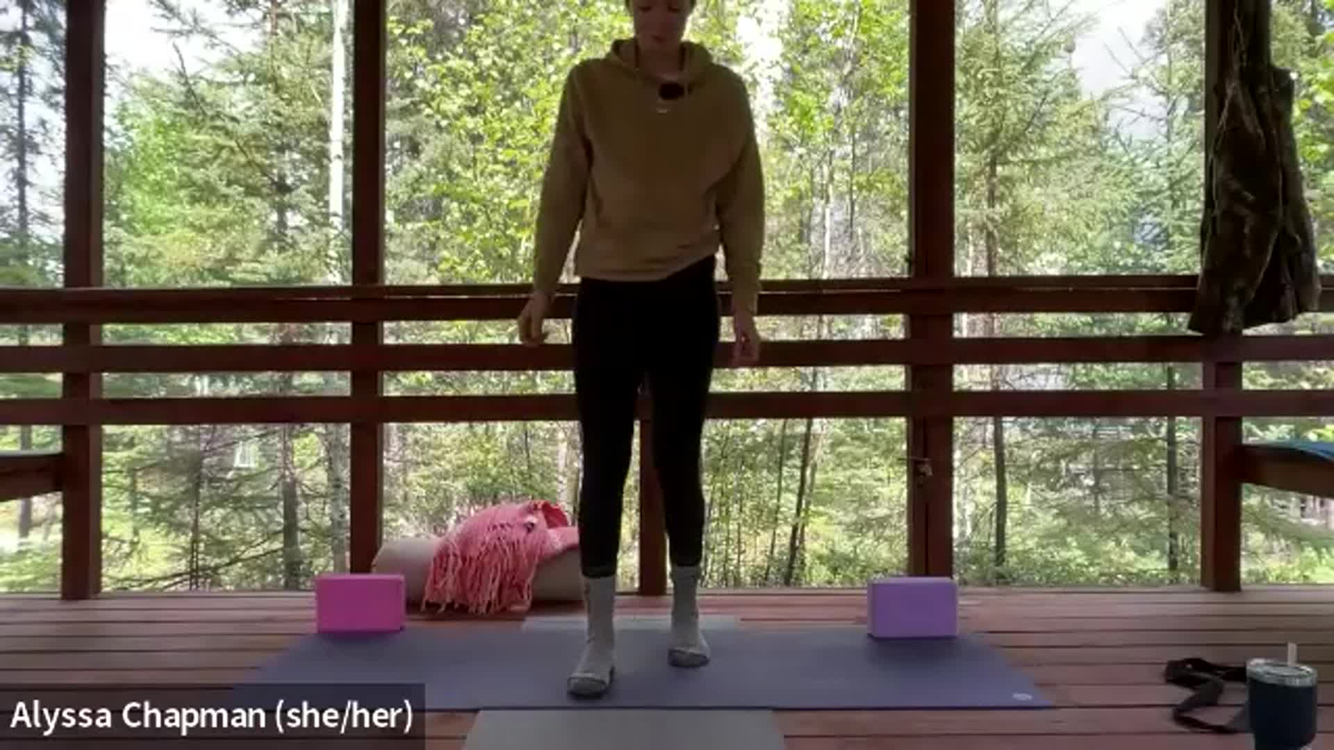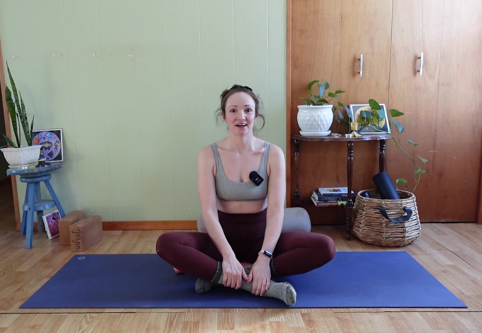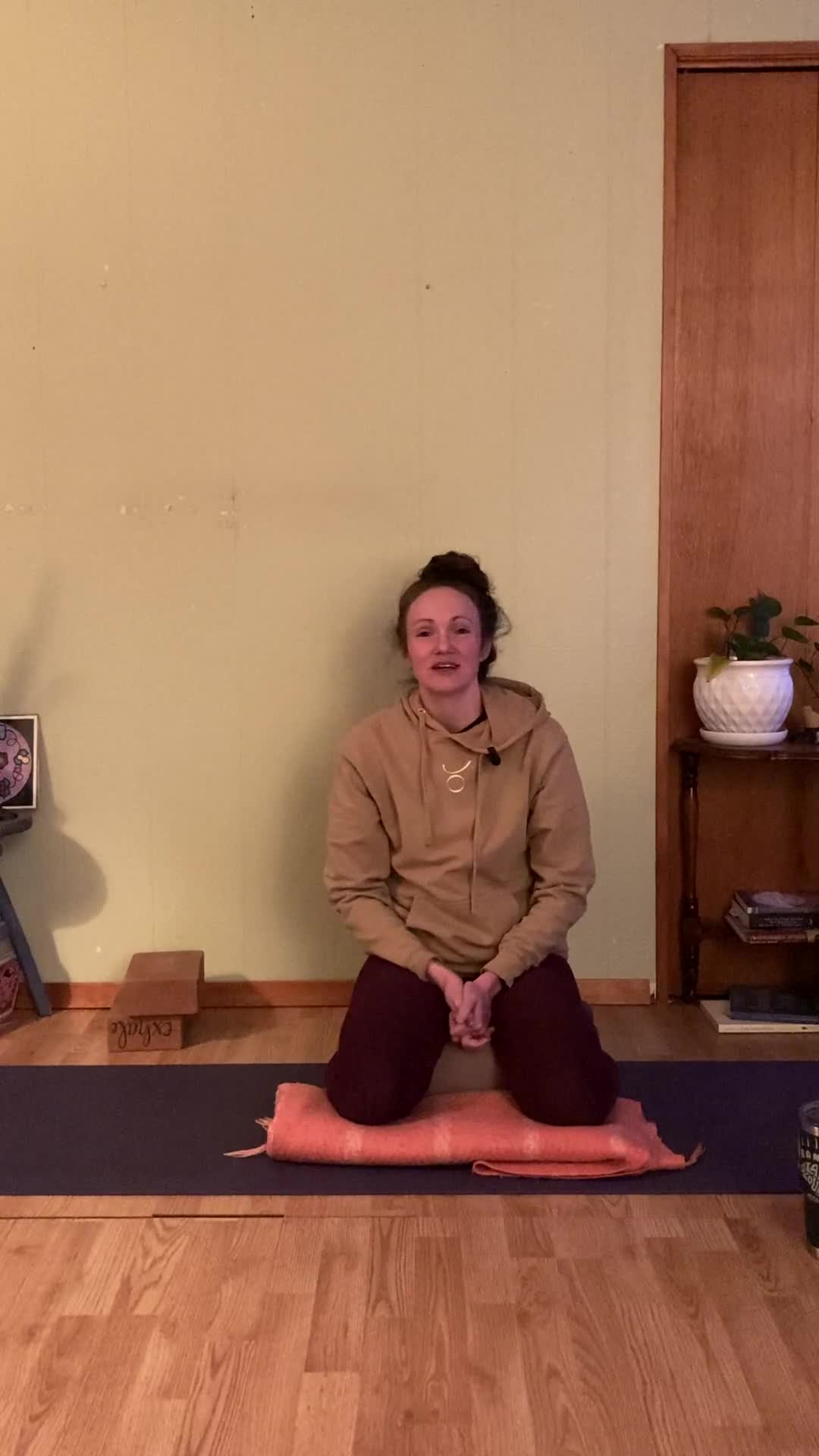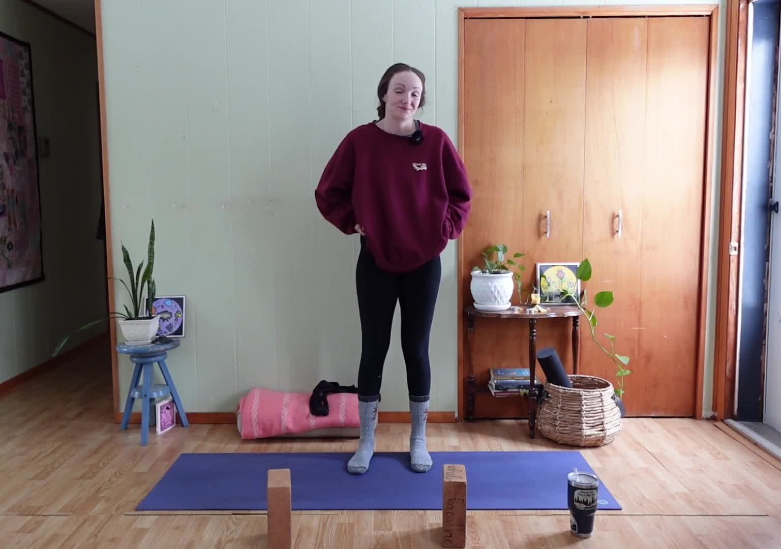 Starting on our feet with lots of movement and breath, moving down to some deep hip exploration where blocks or extra height may be useful, and landing on our backs where you might like your softer cozy props. About 3 min savasana with closing gratitude & final breath together.